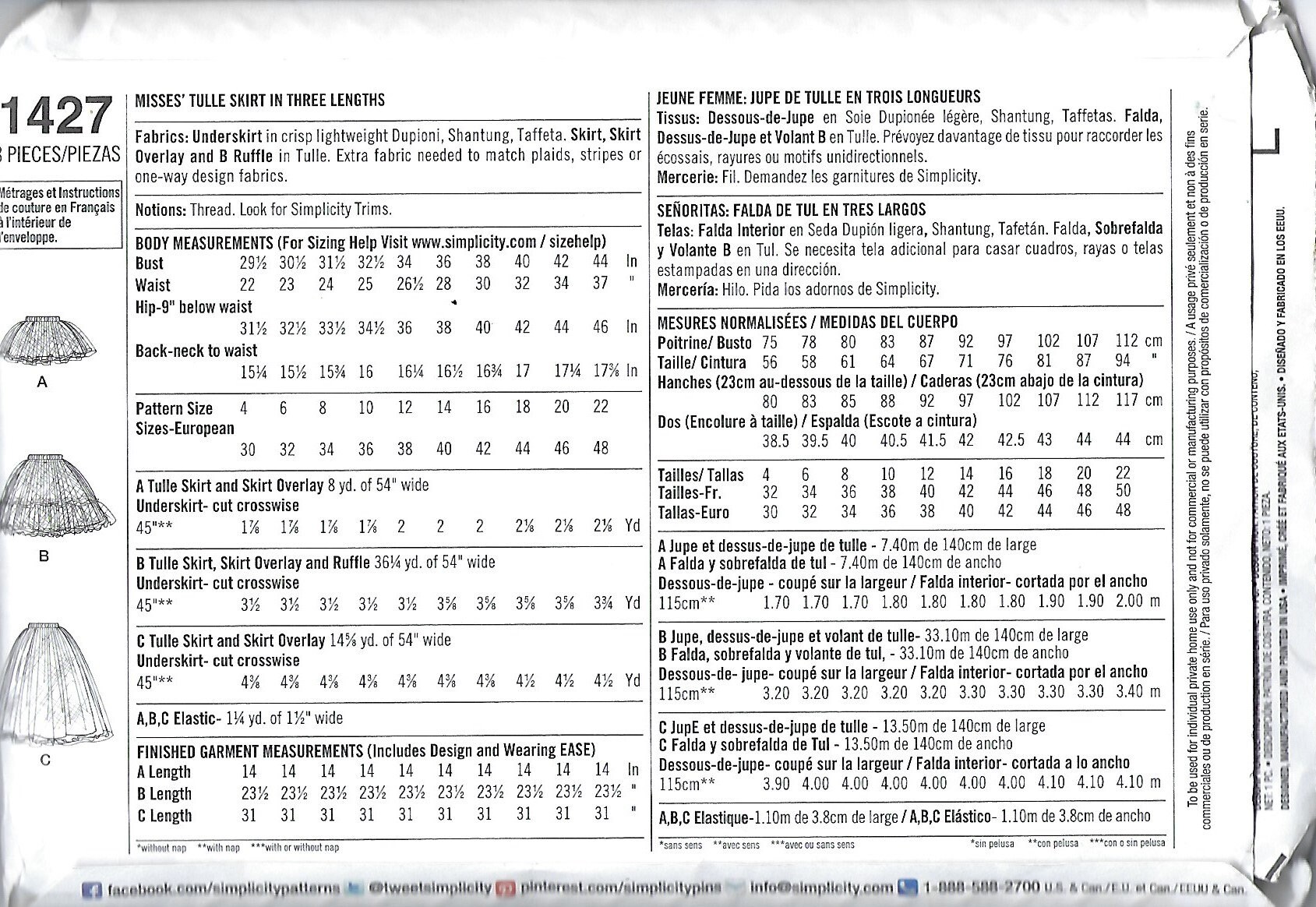 Simplicity 1427 Women S Tulle Skirt Sewing Pattern Sizes 14 22